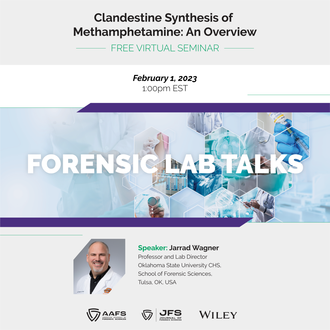 I am delighted to announce that the third Journal of Forensic Sciences (JFS) Forensic Lab Talks Seminar, titled Clandestine Synthesis of Methamphetamine: An Overview, is scheduled for February 1 at 1:00pm ET. The seminar will be presented by Dr. Jarrad Wagner, Professor and Lab Director at the Oklahoma State University CHS, School of Forensic Sciences. Additional information on this virtual seminar, as well as the link to register, will be forthcoming next week.